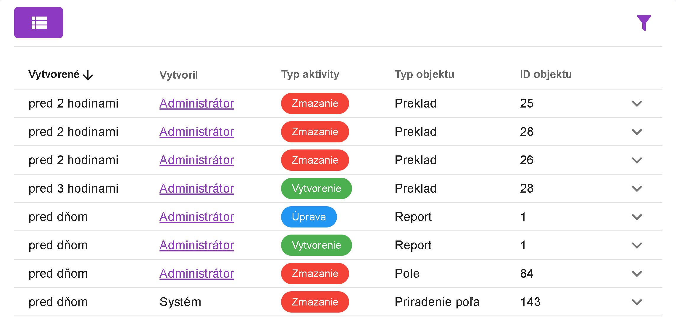 | Vytvorené | Doba, ktorá ubehla od danej aktivity. Pri podržaní ukazovateľa myši nad touto hodnotou sa zobrazí dátum a čas vytvorenia záznamu. |