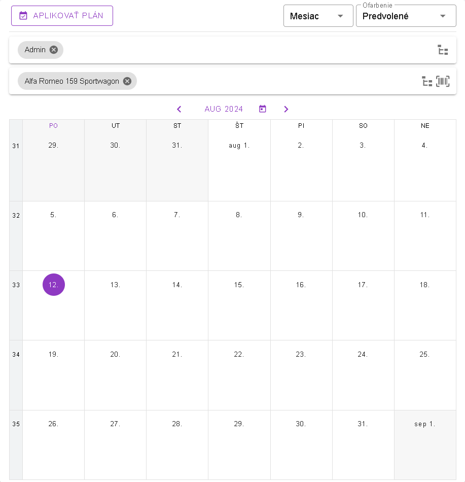 V detaile plánovacieho kalendára nájdete plánovací kalendár, kde máte možnosť vytvárať pracovný plán pre používateľa.