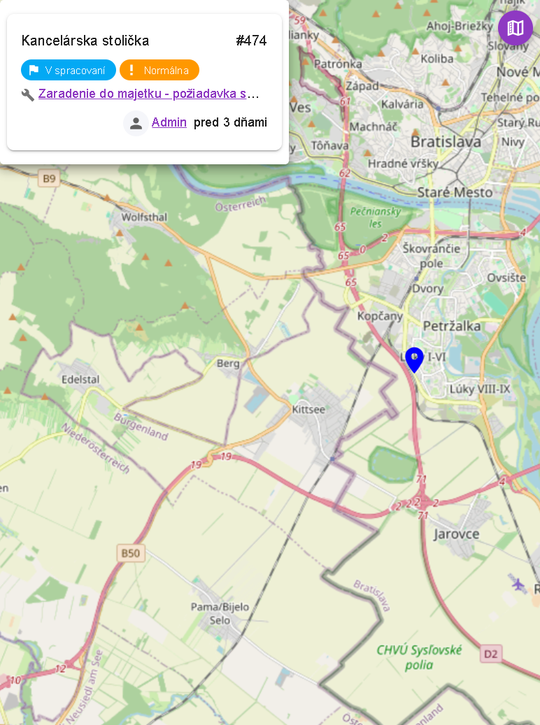- Majetok - Názov majetku, ak bol vyžadovaný pri zadávaní a používateľ ho zadal. Ak zadal viac ako jeden majetok, bude vypísaný prvý a následne doplnený text "a ďalšie X" , kde X bude počet ďalších kusov majetku.