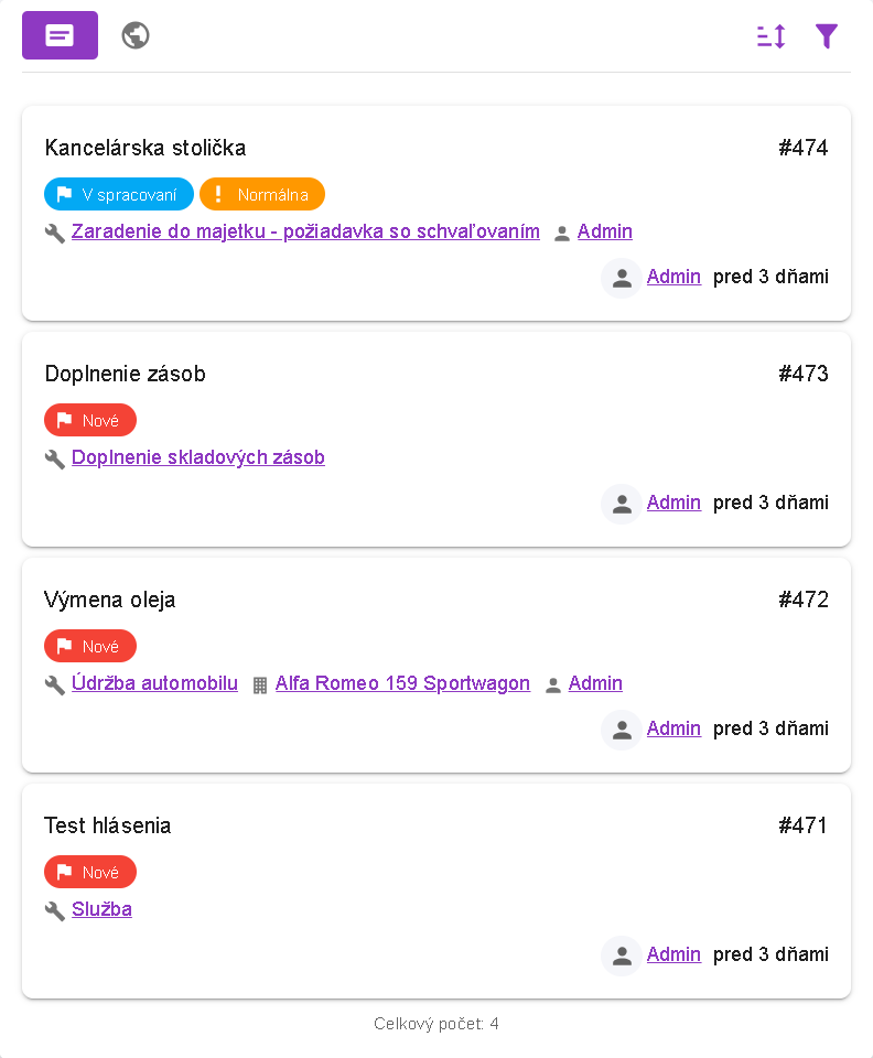 Tlačidlom prepnete na zobrazenie kariet hlásení, ktoré sú zoradené podľa výberu používateľa. V tomto zobrazení sú viditeľné všetky hlásenia. Každá karta hlásenia zobrazuje základné atribúty daného hlásenia. V prípade, že zoznam obsahuje väčšie množstvo kariet, tak sa v spodnej časti tabuľky zobrazí tlačidlo