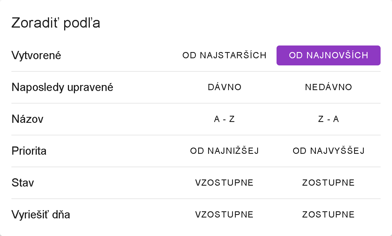 Ikona Zoradiť podľa je dostupná výhradne v zobrazení kariet. Umožňuje prispôsobiť usporiadanie hlásení podľa vlastných preferencií. Po kliknutí na