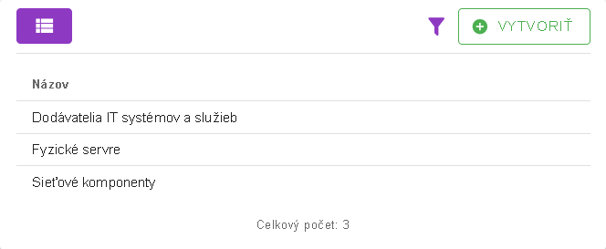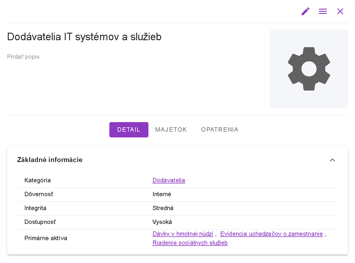 V hlavnom menu vyberte modul označený ako Riadenie rizík a následne prejdete na položku menu Podporné aktíva, zobrazí sa základné zobrazenie podporného aktíva.