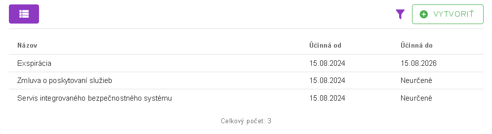 | Účinná od | Zobrazuje začiatok účinnosti zmluvy. |